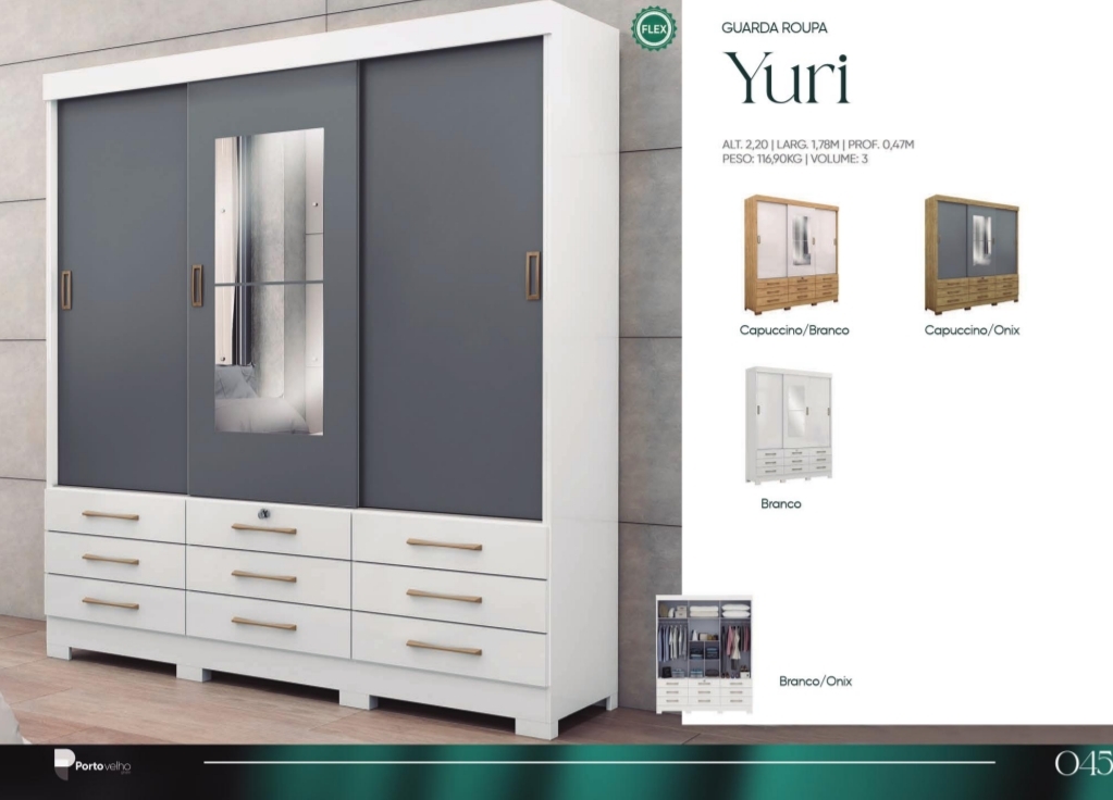 O guarda-roupa Yuri é um móvel elegante e funcional, perfeito para quem precisa de organização e estilo em um só lugar. Com três portas de correr, ele facilita o acesso ao interior e economiza espaço no ambiente. Cada porta possui um design moderno, com acabamento liso ou espelhado, conforme o modelo.
