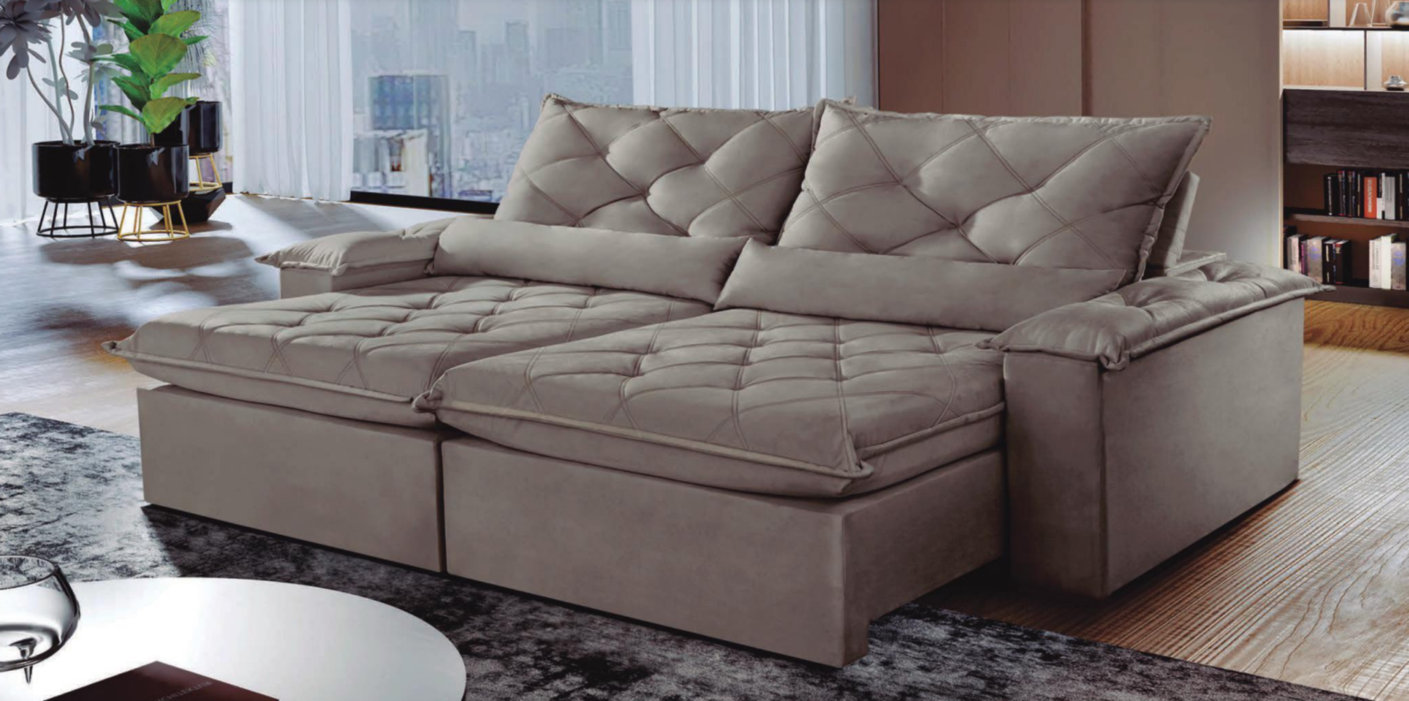 Outro grande diferencial é a sua função retrátil, que permite ampliar a profundidade para 1,80m quando totalmente aberto, criando um verdadeiro espaço de descanso. Fechado, com 1,24m de profundidade, ele se ajusta perfeitamente à sua sala, sem comprometer o espaço de circulação.